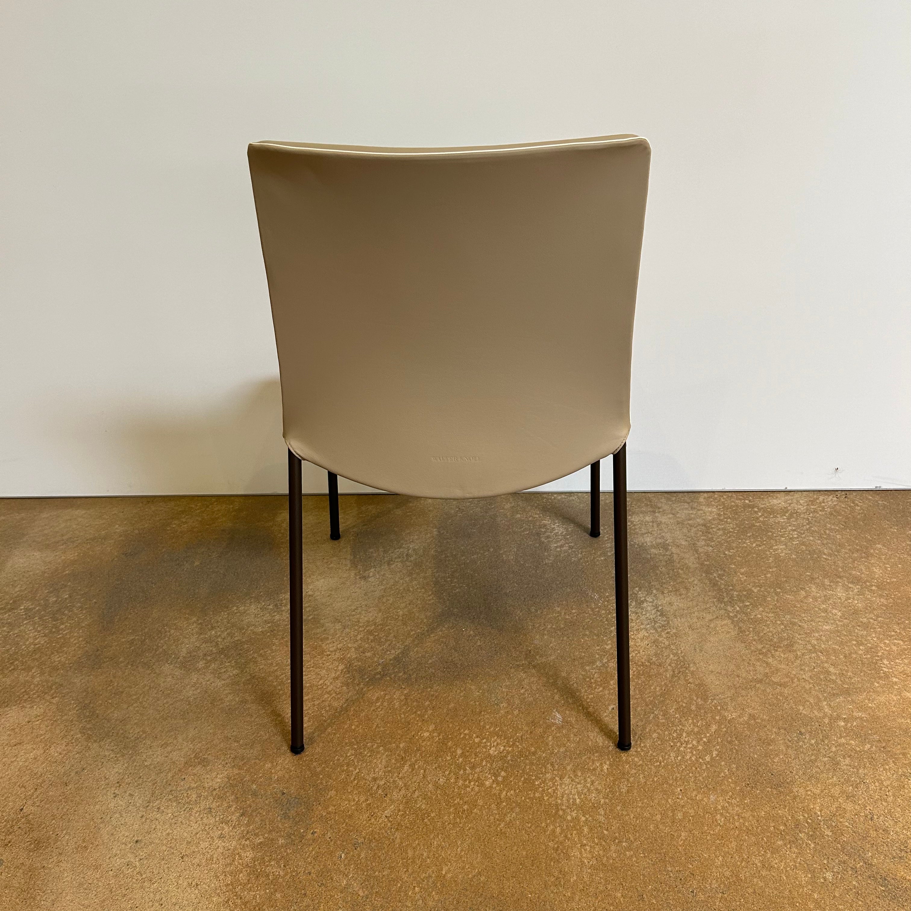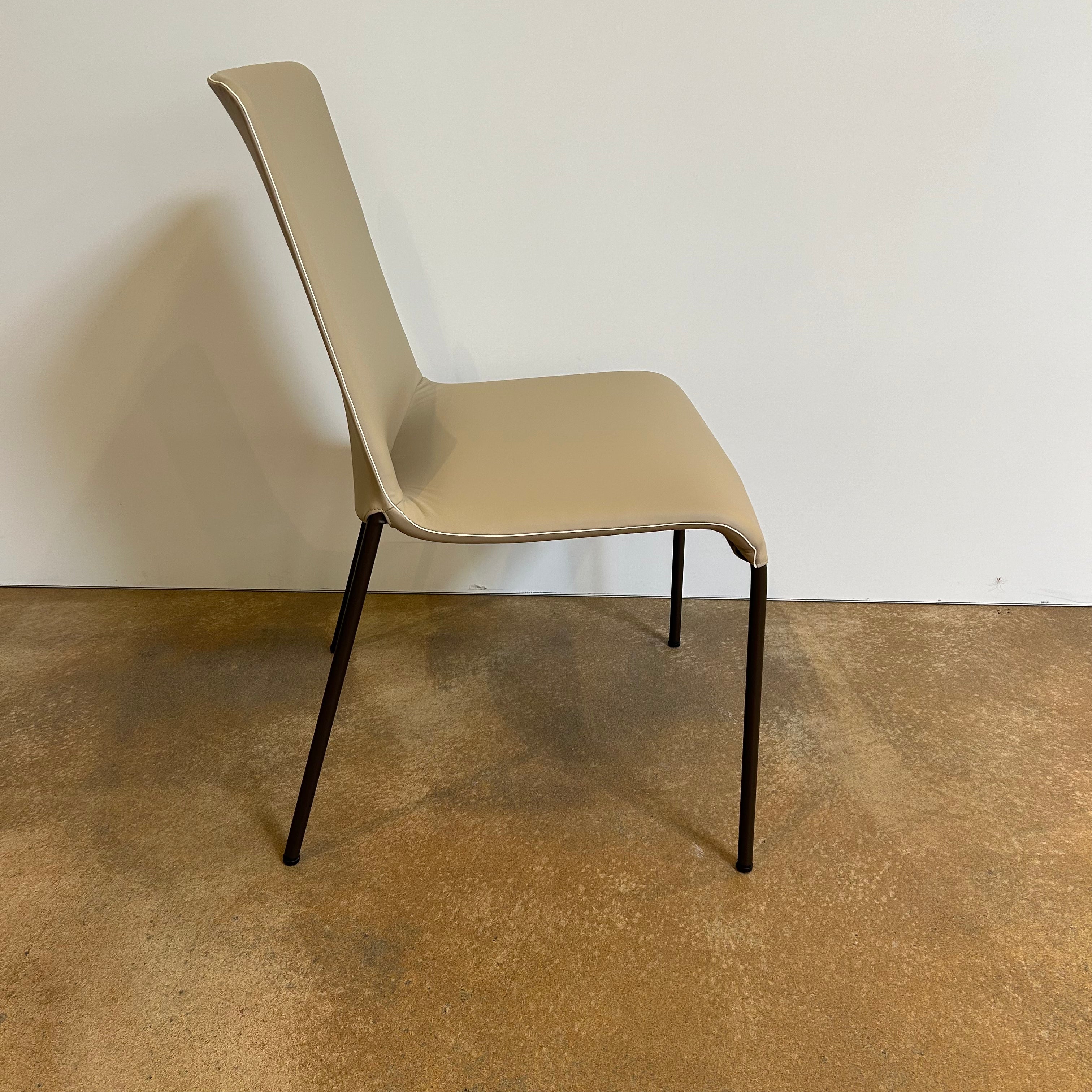 Ausführung: hoher Rücken, Armlehnen, Leder Ascot, Farbe pearl, Biese weiß, Gestell: matt bronze, Filzgleiter